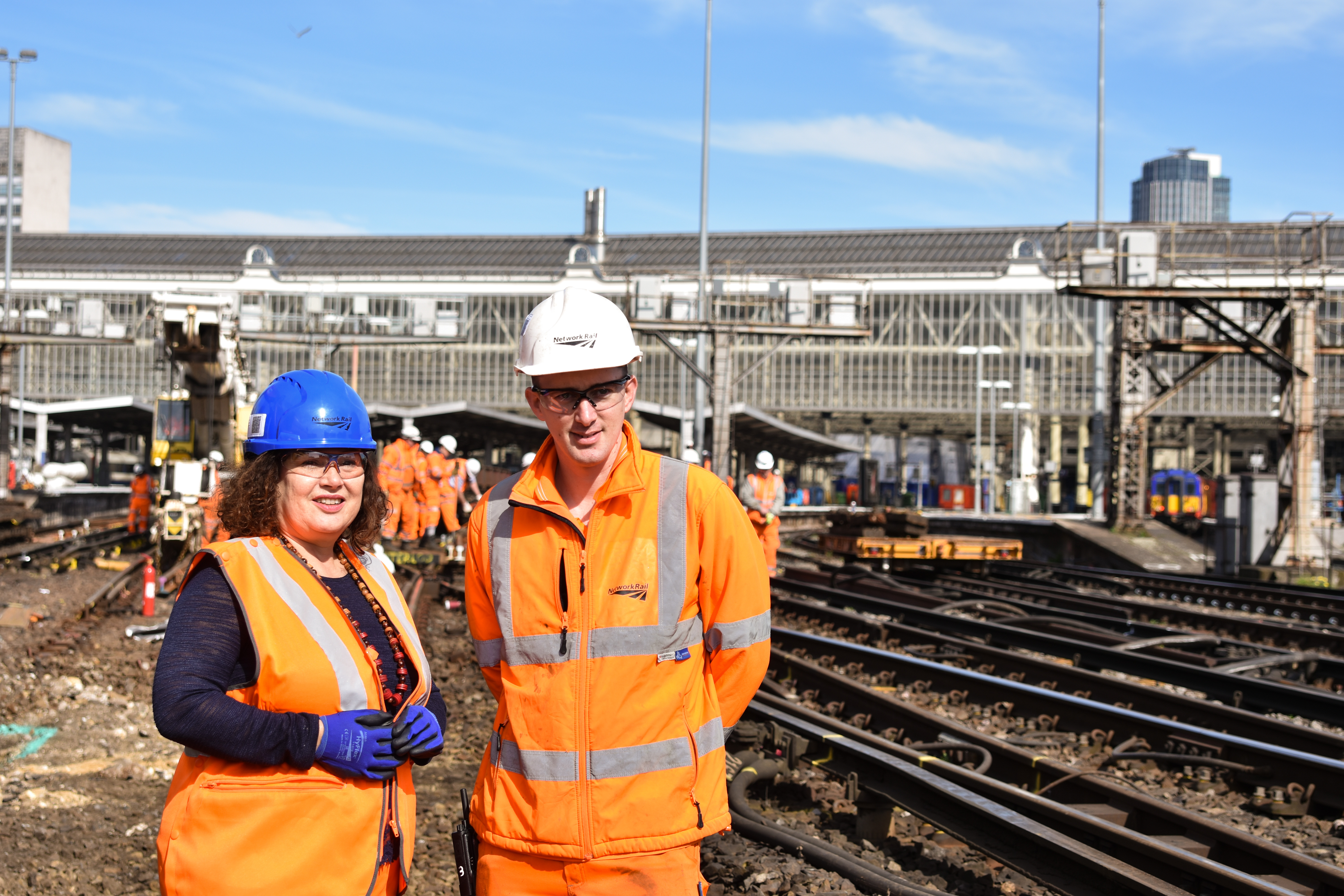 Leonie Cooper, assembly member for Merton and Wandsworth, speaks with Network Rail staff on track at Waterloo