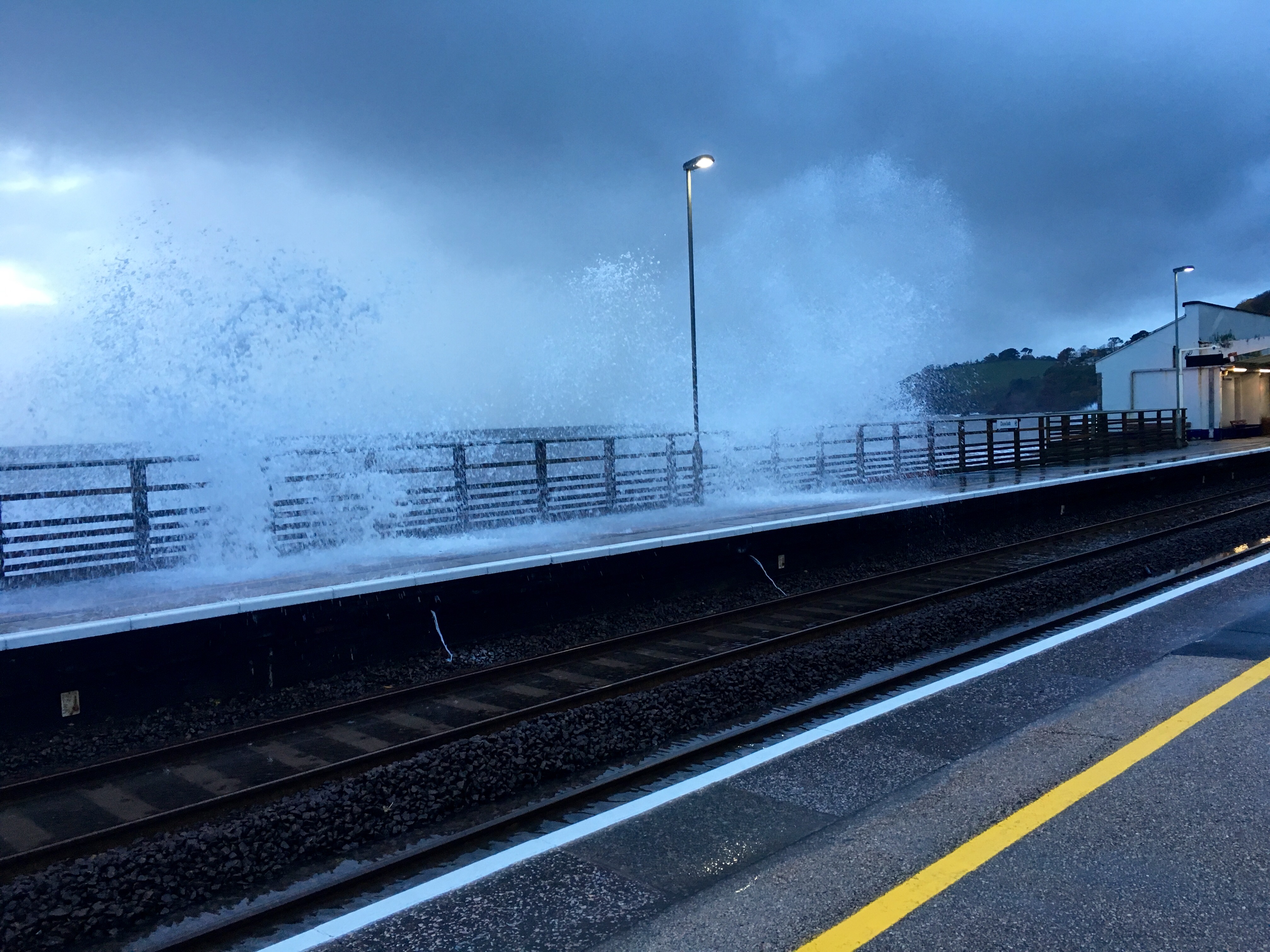 Waves over Dawlish station platforms