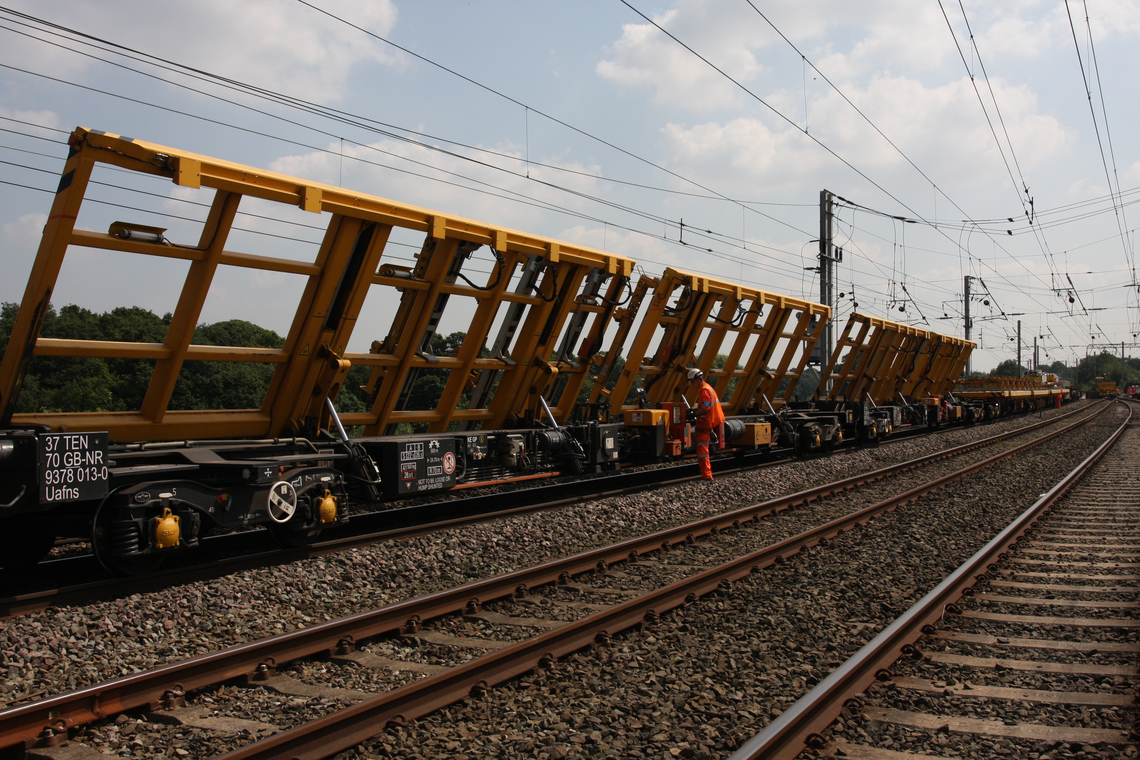 Tilting wagons in action at Golborne Jn . West Coast main line blockade work - July 2013.