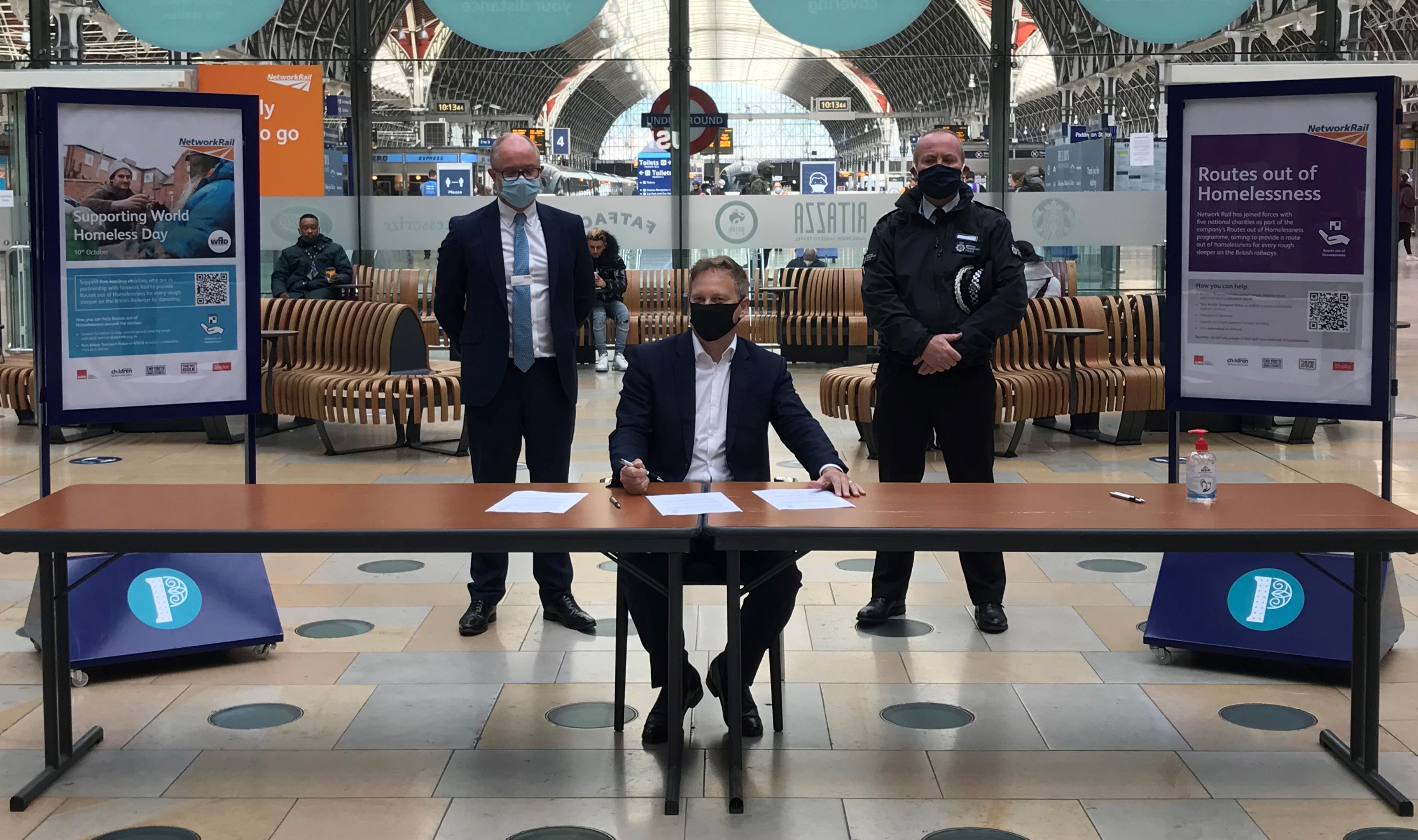 Network Rail Chief Executive Andrew Haines, Secretary of State Grant Shapps and British Transport Police Assistant Chief Constable Charlie Doyle met yesterday (Wednesday 7 October) at London Paddington station, to sign the first pan-industry homelessness charter as part of a wide-reaching programme of efforts to support a route out of homelessness for every rough sleeper.