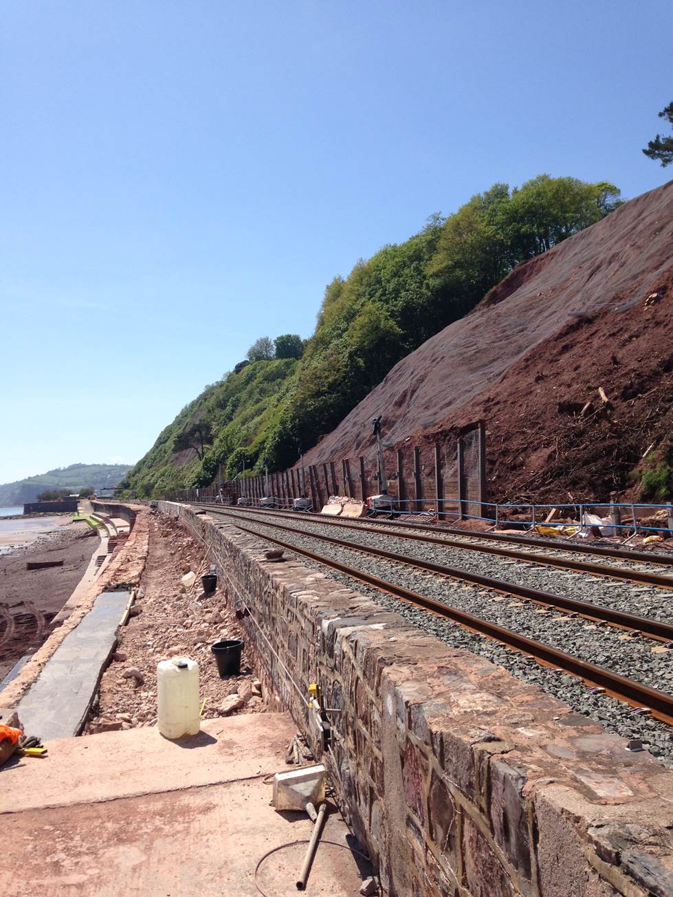Work to repair the sea wall and walkway at Teignmouth, prior to reopening the Teignmouth section.