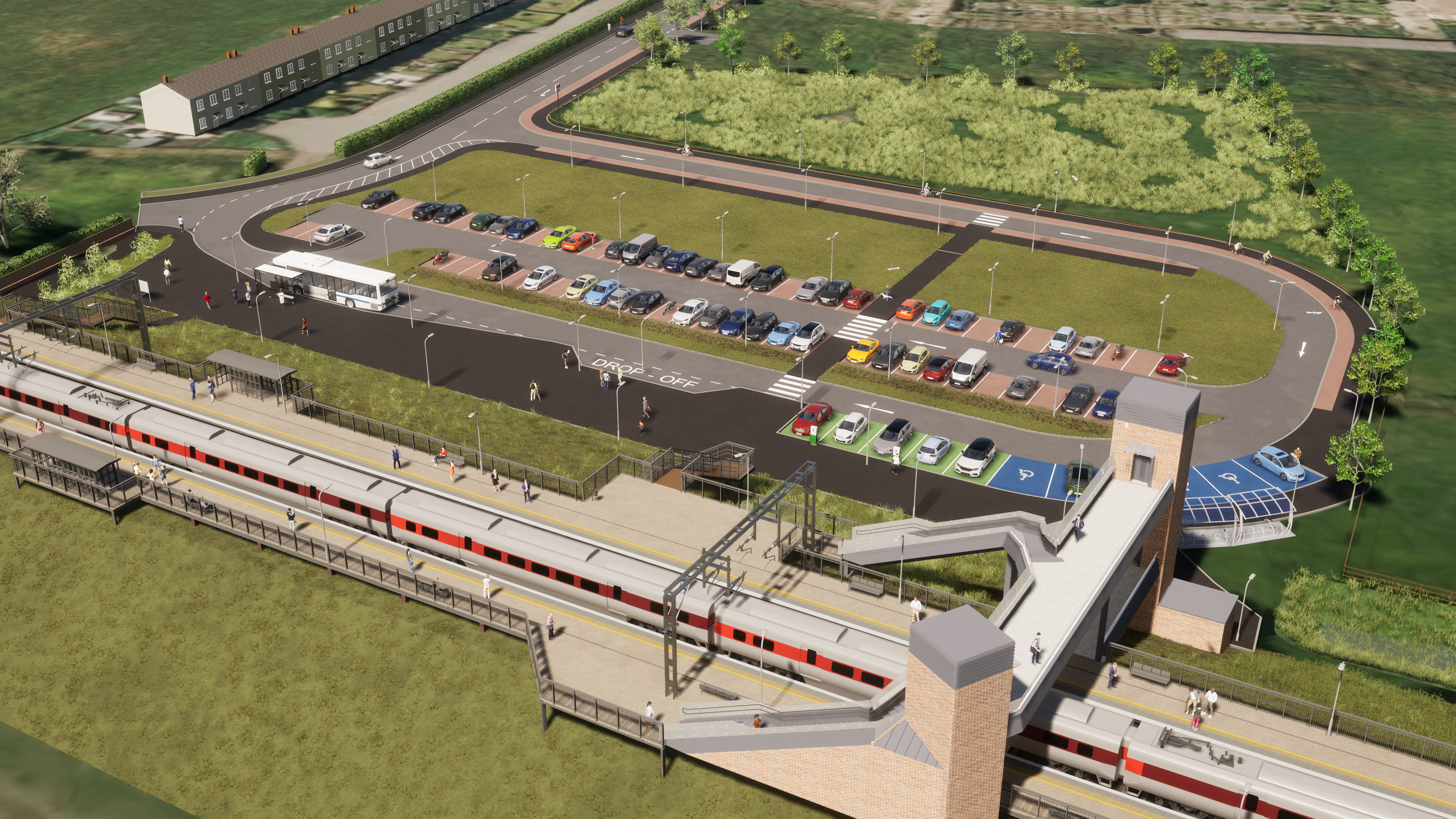 This is an Artist's Impression (AI) showing the layout for the proposed new station at Reston in the Scottish Borders.