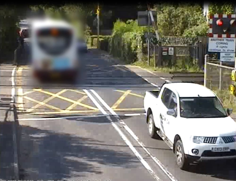 A bus races the red lights at Yapton level crossing, Sussex, and gets nabbed by the red light cam