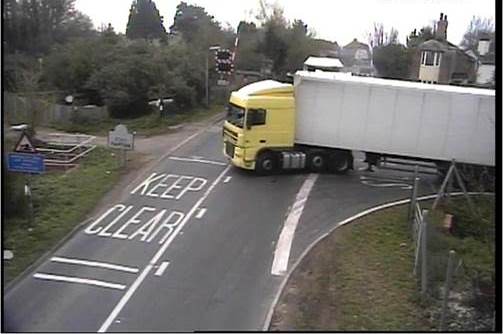 A lorry, in the background, sits on the level crossing while another pulls out in front of it.