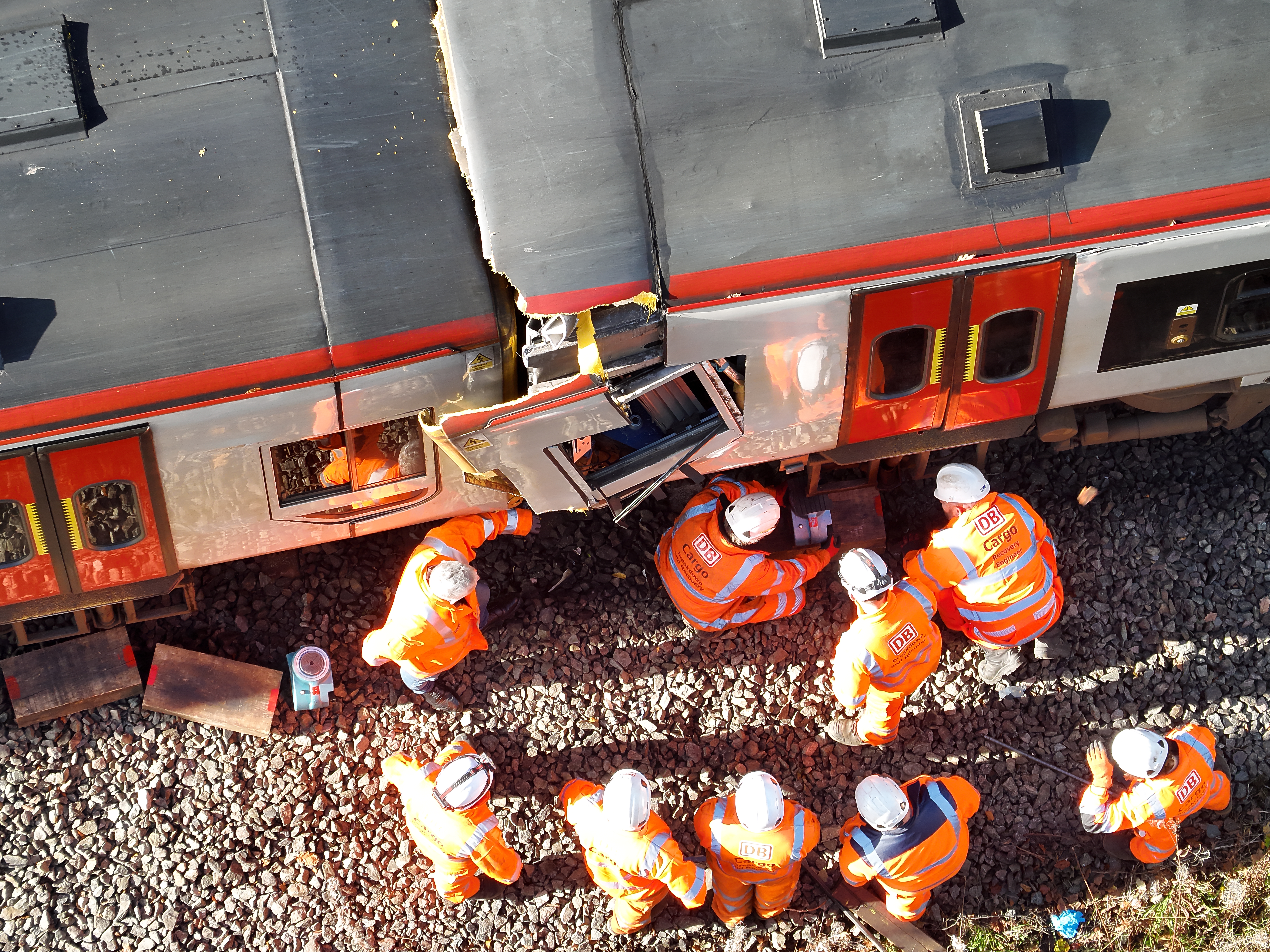 Teams work to separate the damaged trains on the Cambrian Line - October 2024