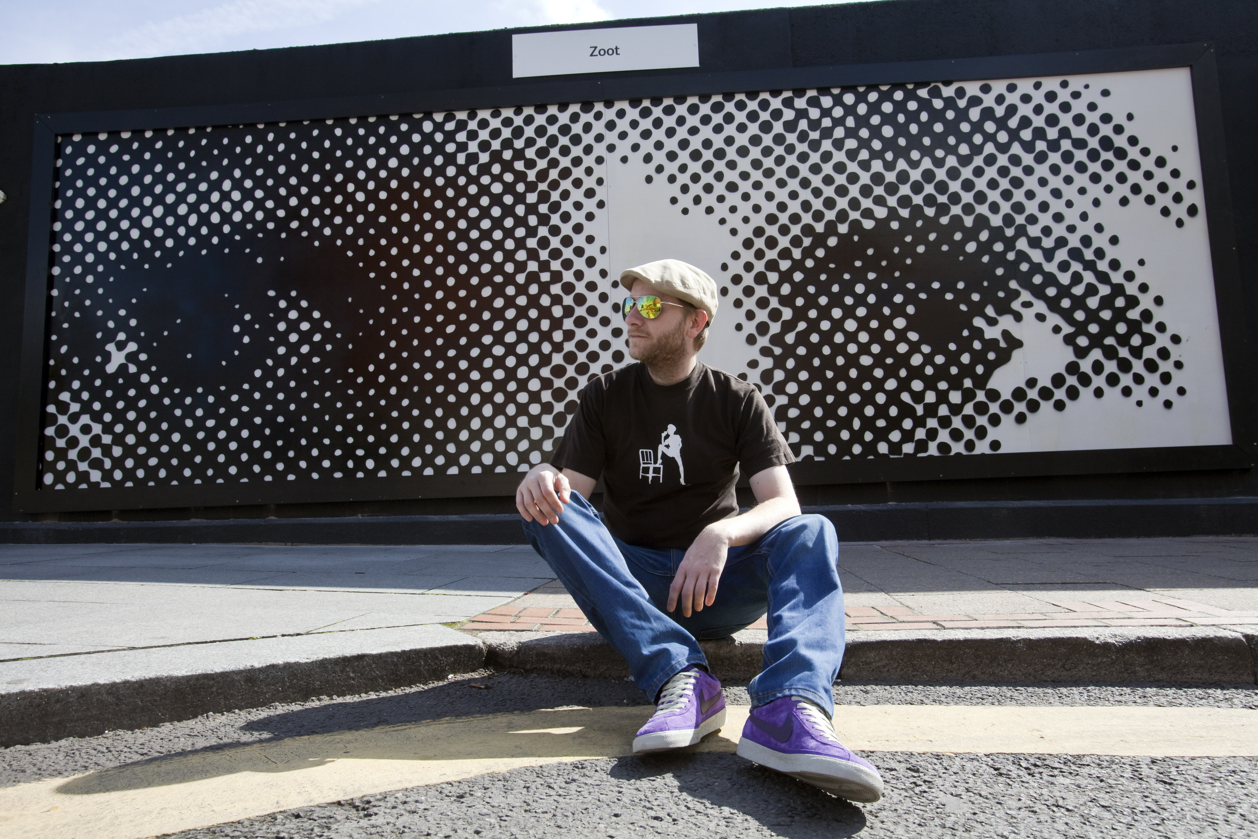 Artist Zoot with his black and white installation on display near Birmigham New Street station. The location on Hill Street was previously a bare, uninspiring wall covered in green mould. After an approach from Regenerated and Birmingham City Council, Network Rail has worked with local artists and students from King Edward VI Sheldon Heath Academy to transform the space into a showcase for local artistic talent.