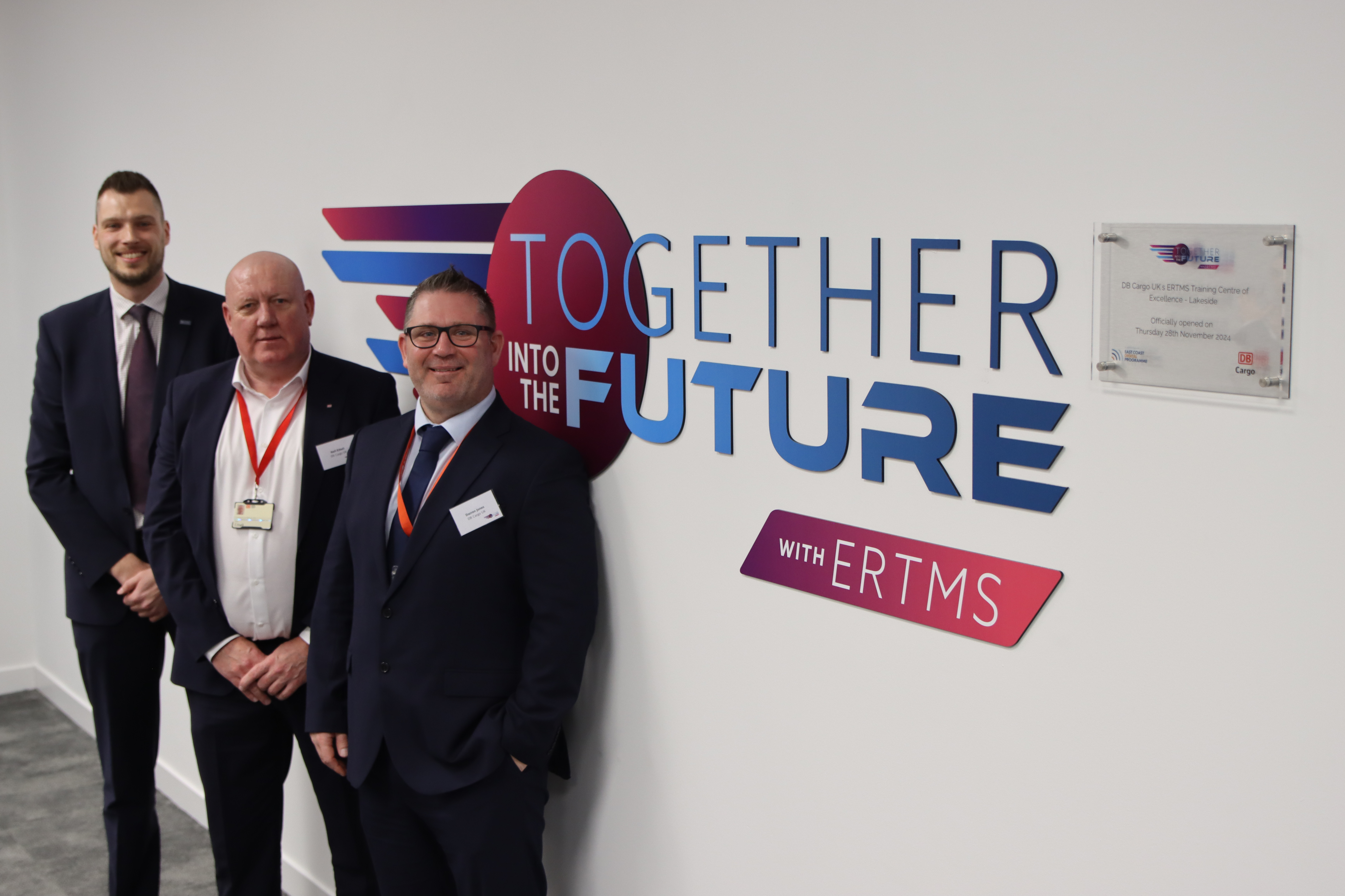 Pictured at the official opening are (from left): Ed Akers, industry partnerships director at the East Coast Digital Programme; Neil Ethell, chief operating officer at DB Cargo UK and Darren Jones, ERTMS project lead at DB Cargo UK.JPG